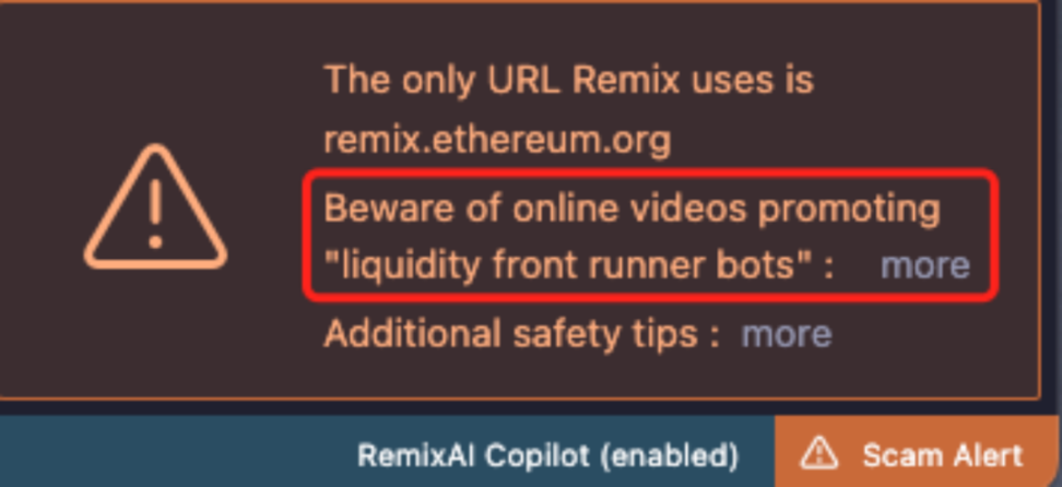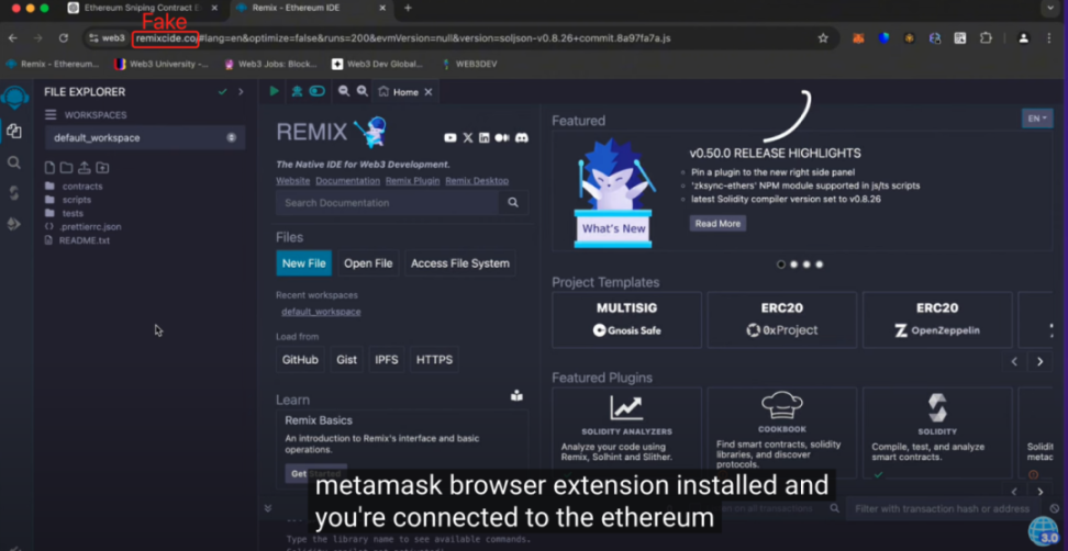 骗子声称,他的这个机器人可以监控 Ethereum 上的新代币和大的价格变化,寻找套利机会,用户只需要坐等收钱就行。而用户首先得有个 MetaMask 钱包,然后打开教程中提供的 Remix 链接(假 Remix)。
