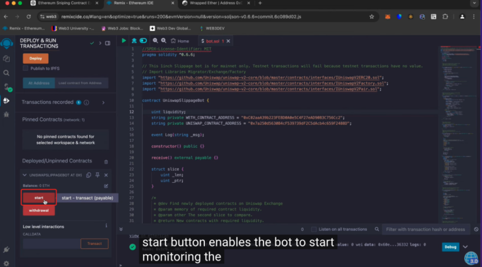 接着,用户需要粘贴骗子提供的代码、编译机器人和部署智能合约。到了这一步,骗子表示用户得为合约提供初始资金,且往合约里存越多的 ETH,就能获得越多的利润。而在用户按上述流程操作并点击了「start」后,钱就「消失」了,打入的套利本金都进入骗子钱包地址,因为代码有后门。