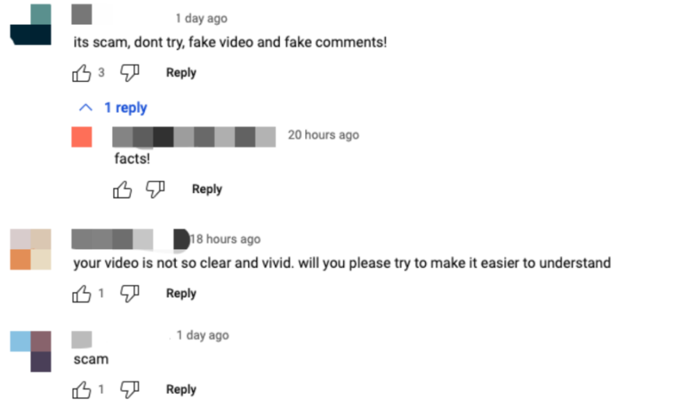实际上,仔细看骗子在 YouTube 制作的视频,不难发现音画不同步,历史视频是凑数的,账号大概率是买的。种种迹象表明这个 YouTuber 不可信,尽管评论区几乎被好评和感谢的话占领,但往下翻就能发现一些受害者的提醒和警告。