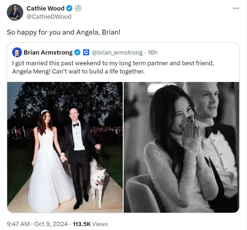 近日,Brian 在社交平台上宣布与已 Angela Meng 结婚一周,这一讯息迅速引发了加密社群的热烈讨论。来自全球加密领域的知名人物纷纷送上祝福,Ark Invest 的 Cathie Wood(「木头姐」)和 MicroStrategy 创办人都对这对新婚夫妇表达了诚挚的祝贺。