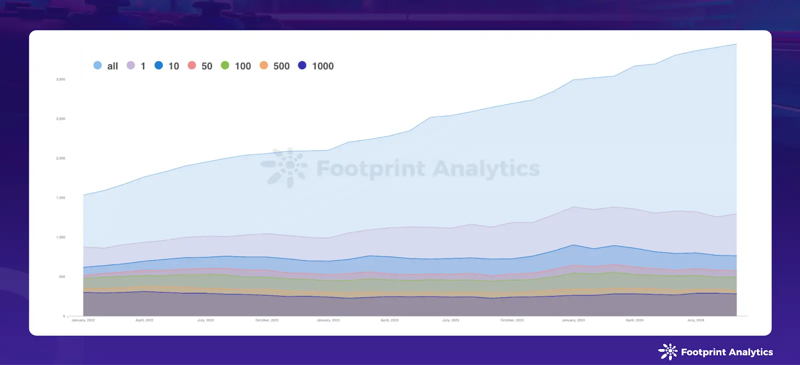 区块链游戏领域现已包含 3,448 款游戏,其中 1,295 款游戏处于活跃状态。值得注意的是,有 285 款游戏吸引了超过 1,000 名月活跃链上用户(MAU),这占到了所有游戏的 8.3%,以及活跃游戏的 22.0%。这种分布情况凸显了区块链游戏领域在用户留存和参与度方面所面临的持续挑战。