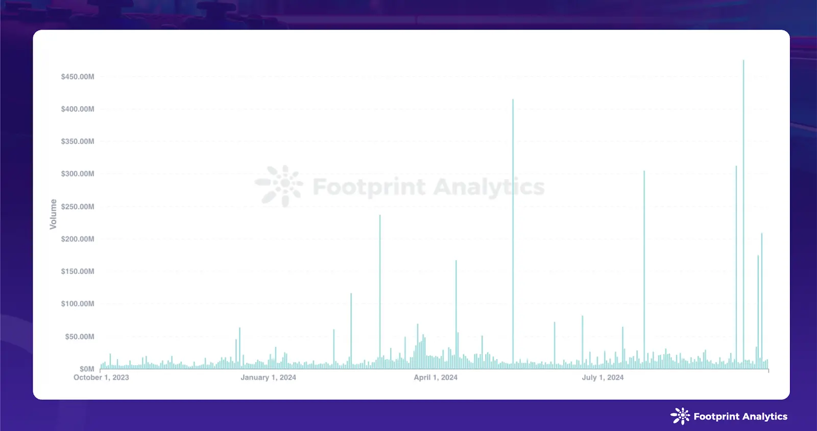 然而,区块链游戏的每日交易额却下降了 22.9%,最终定格在 1,310 万美元。需要注意的是,这一数据排除了 9 月 13 日、17 日、25 日和 27 日因同一游戏内内部钱包转账而产生的几个异常数据点。
