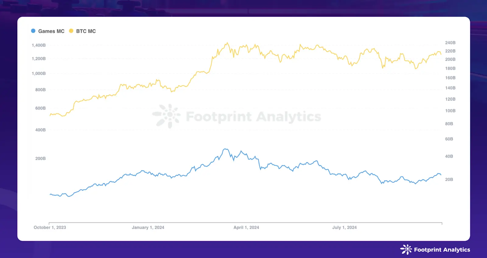 9 月份,Web3 游戏领域迎来了反弹,与加密市场整体的上升趋势保持一致。区块链游戏代币的市场总值从 180 亿美元跃升至 232 亿美元,实现了 29.2% 的显著增长。这一复苏,紧随上个月的大幅下跌之后,显示出该领域与宏观加密市场动态的密切关联。