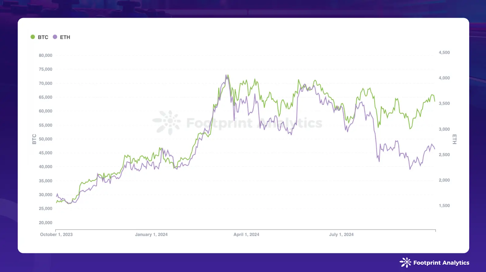 加密市场在 9 月份展现了强劲的表现。比特币以 57,429 美元开盘,月末收于 63,485 美元,实现了 10.5% 的涨幅。而以太坊虽然表现积极,但仍然不及比特币。以太币从 2,426 美元起步,最终以 2,603 美元结束,涨幅为 7.3%。值得注意的是,9 月中旬 ETH/BTC 的价格比创下了 0.0386 的新周期低点。