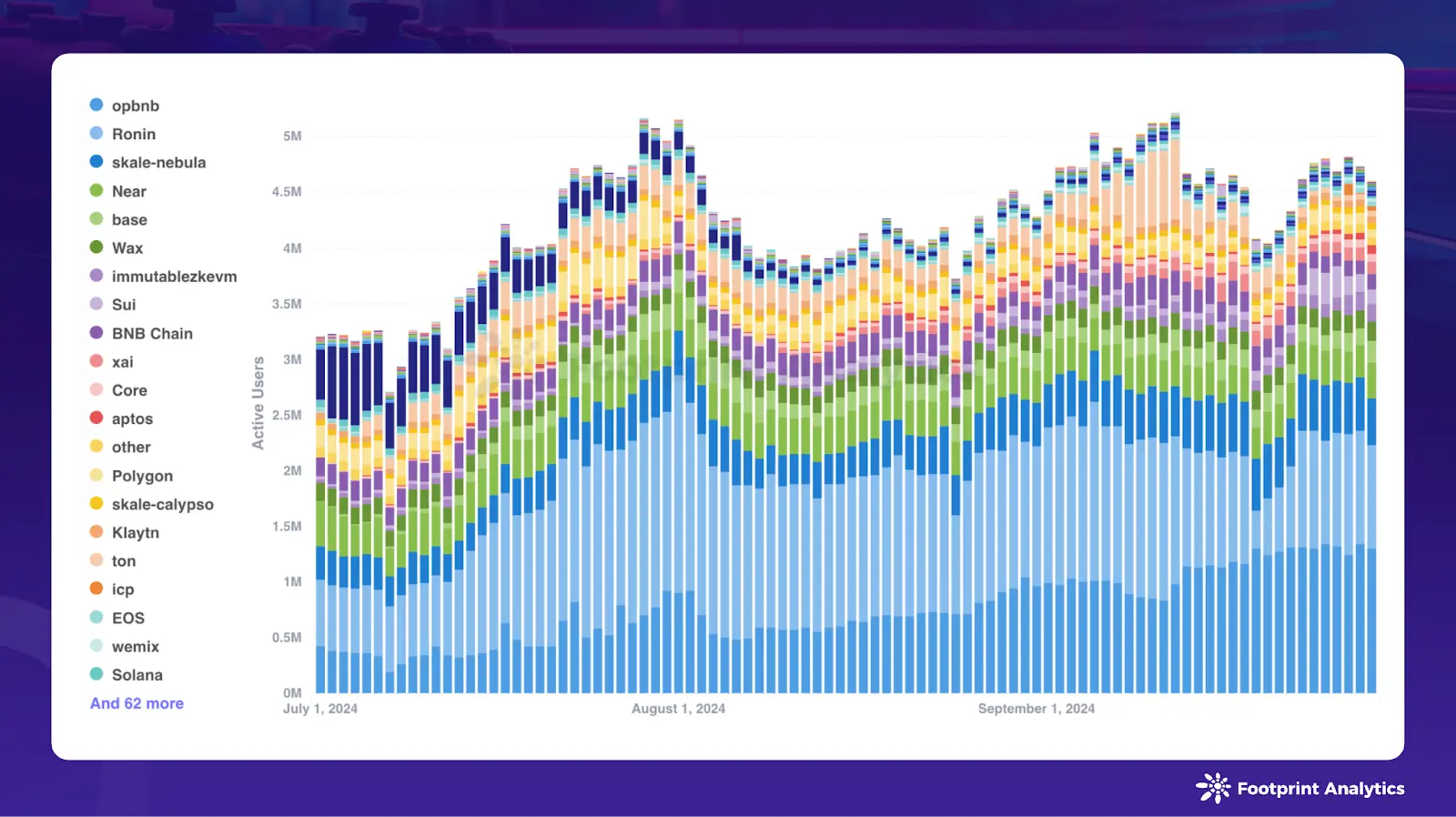相比之下,Ronin 的 DAU 份额持续下滑,从 8 月的 29.5% 跌至 9 月的 20.1%。这一趋势主要归因于 Pixels 的表现下滑,其 DAU 在本月内从 70 多万降至 47 万。值得注意的是,尽管 Ronin 在 8 月的平均 DAU 几乎是 opBNB 的两倍,但 9 月 opBNB 实现了对 Ronin 的反超,标志着竞争格局的重要转变。