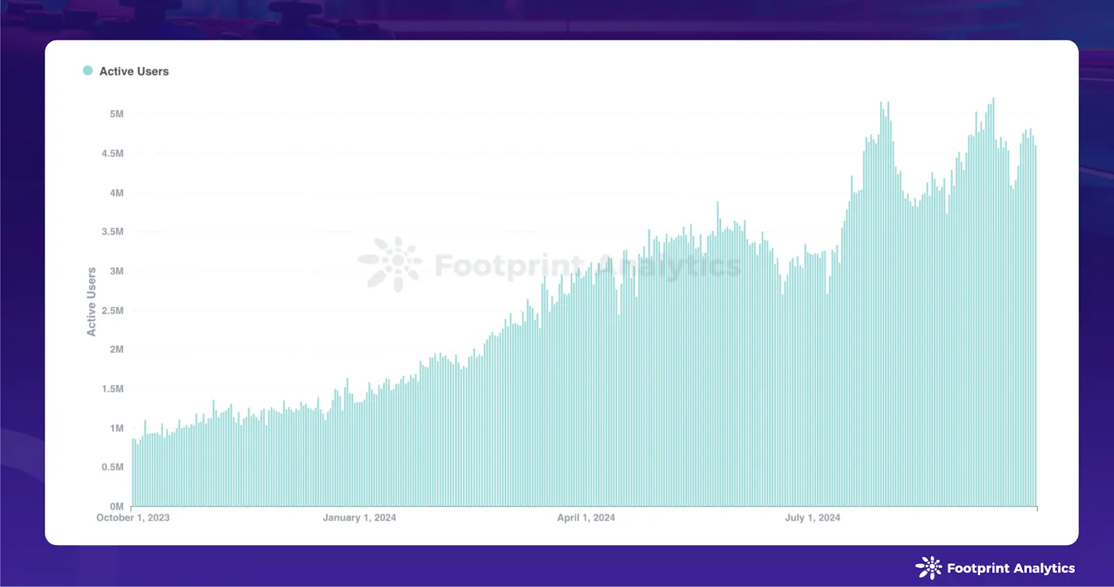 9 月份,区块链游戏代币的市场总值增长了 29.2%,达到 232 亿美元,日活跃用户(DAU)数量上升了 12.3%,达到 470 万。一个显著的趋势是,Telegram 游戏迅速崛起,这引发了区块链网络与中心化交易所在用户获取方面的激烈竞争。然而,这种繁荣态势引发了对于链上参与度可持续性的疑问。