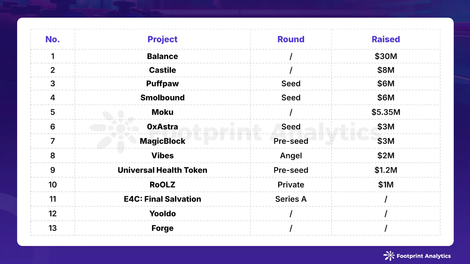 9 月,Web3 游戏领域在 13 次融资事件中获得了 6,560 万美元的投资,较 8 月增长 6.6%。其中三次融资未披露具体金额。
