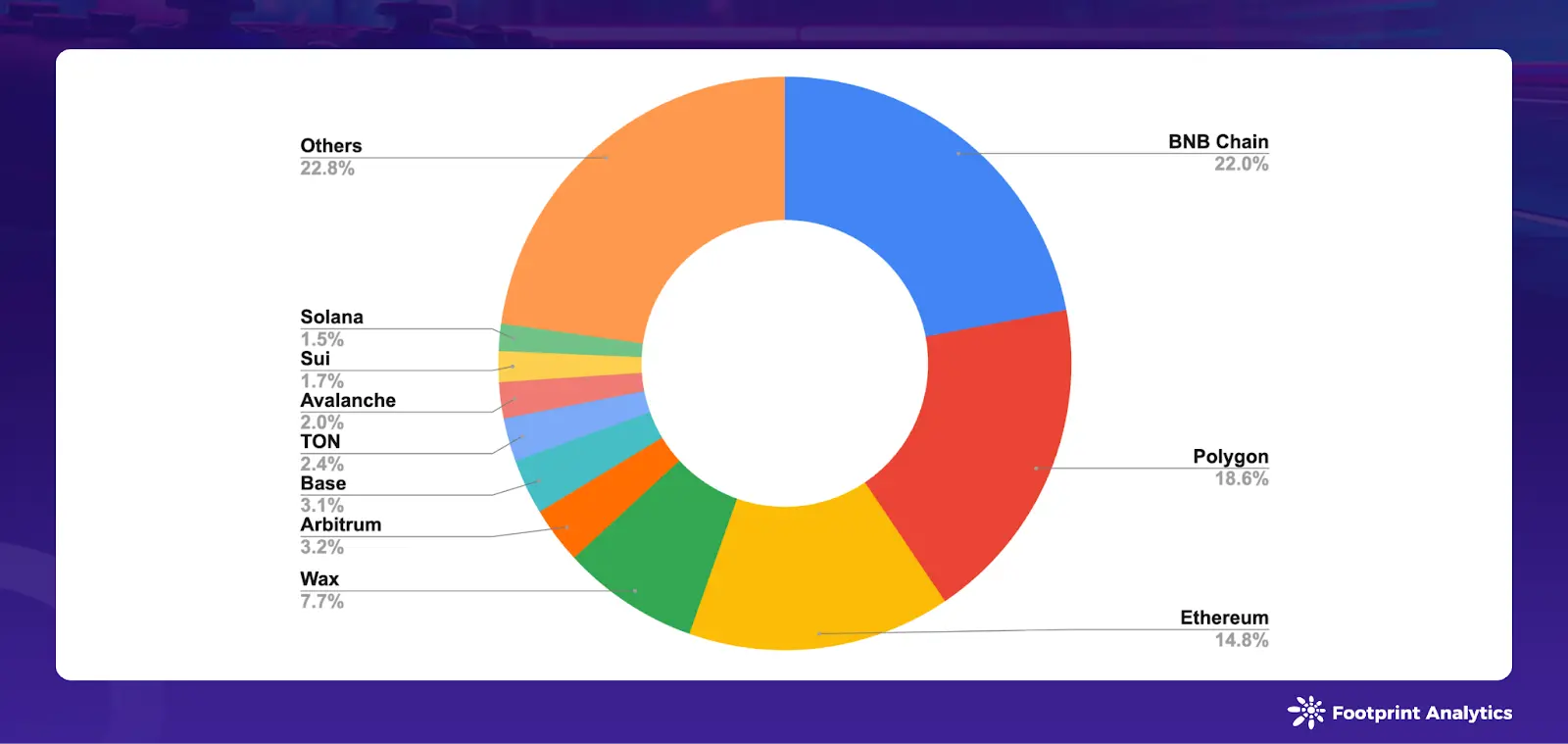 9 月份,各区块链网络的活跃游戏数量增至 1,563 款,较 8 月增长了 4.5%。市场主导地位保持稳定, BNB 链、 Polygon 和 以太坊 分别占据游戏数量的 22.0%、18.6% 和 14.8%。
