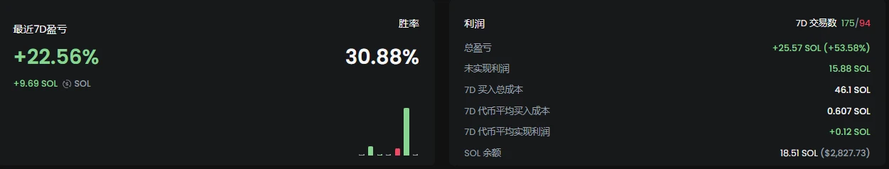 盈亏数据披露: 6 天测试后,跟单系统共购买了 81 个代币,仅 29 个代币盈利为正,胜率 35.8% 。 盈利 TOP 1 共盈利 1247 美元, 为总投入资金的 55% ;TOP 5 共盈利 2408 美元,为总资金的 106% 。亏损 TOP 1 共亏损 214 美元,占比 9.4% ,TOP 5 共亏损 789 美元,占比 34.3% 。表现出了与跟单地址趋同的状态。