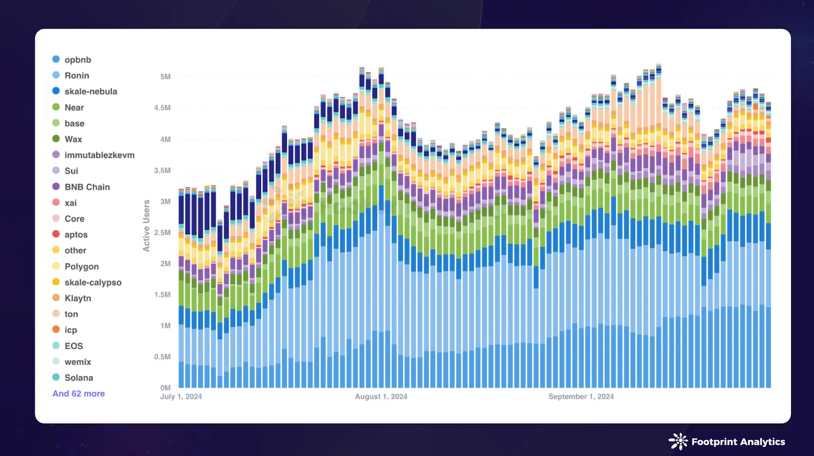 相比之下,Ronin 的 DAU 份额持续下滑,从 8 月的 29.5% 跌至 9 月的 20.1%。这一趋势主要归因于 Pixels 的表现下滑,其 DAU 在本月内从 70 多万降至 47 万。值得注意的是,尽管 Ronin 在 8 月的平均 DAU 几乎是 opBNB 的两倍,但 9 月 opBNB 实现了对 Ronin 的反超,标志着竞争格局的重要转变。