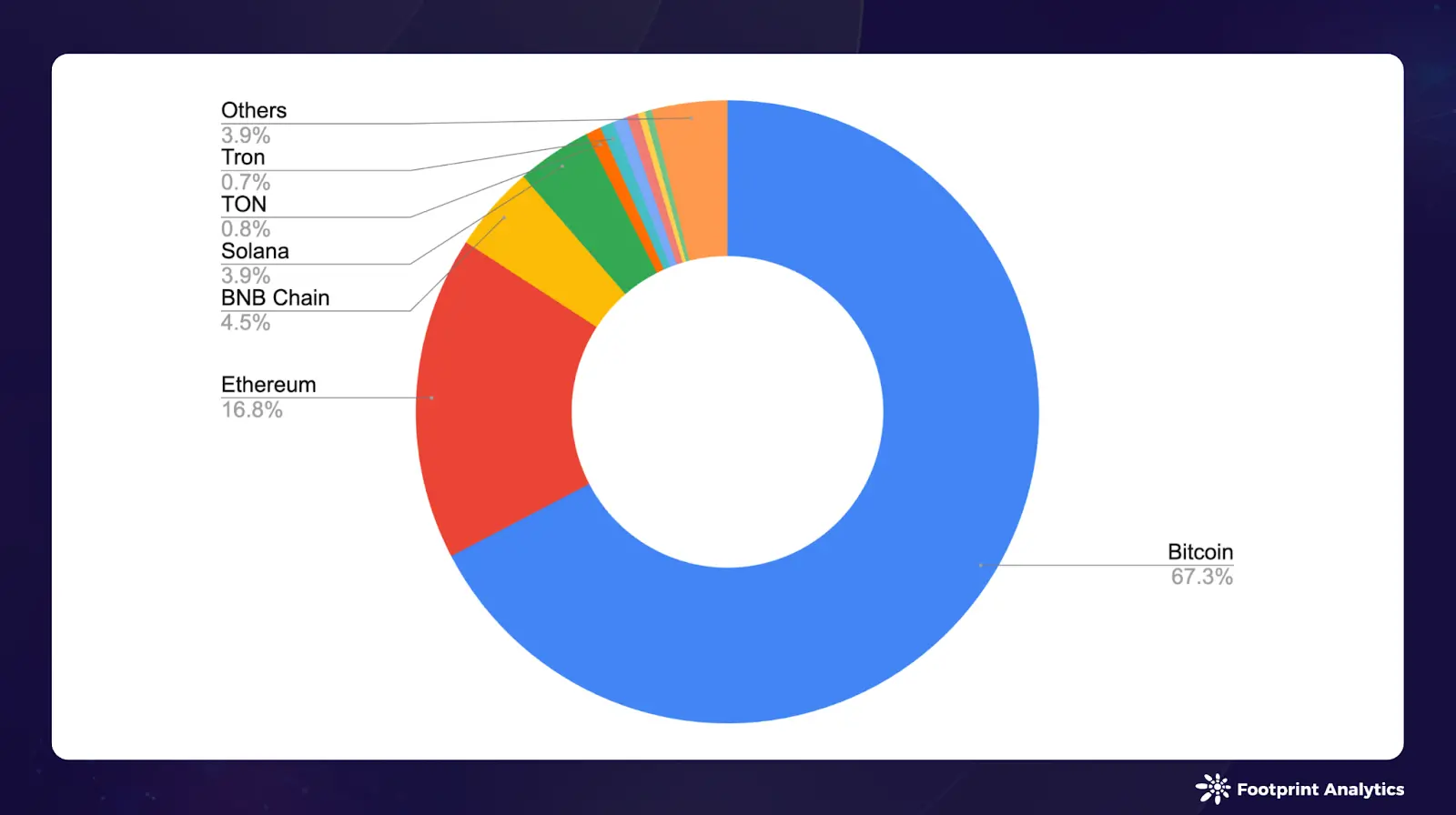 2024 年 9 月,区块链加密货币的总市值达到了 1.9 万亿美元,较 8 月增长了 6.9%。市场主导地位依然由比特币(67.3%)、以太坊(16.8%)、BNB 链(4.5%)和 Solana(3.9%)占据。比特币和 BNB 链维持了各自的市场份额,而以太坊的市场份额绝对值下降了 0.6%, Solana 则上升了 0.3%。