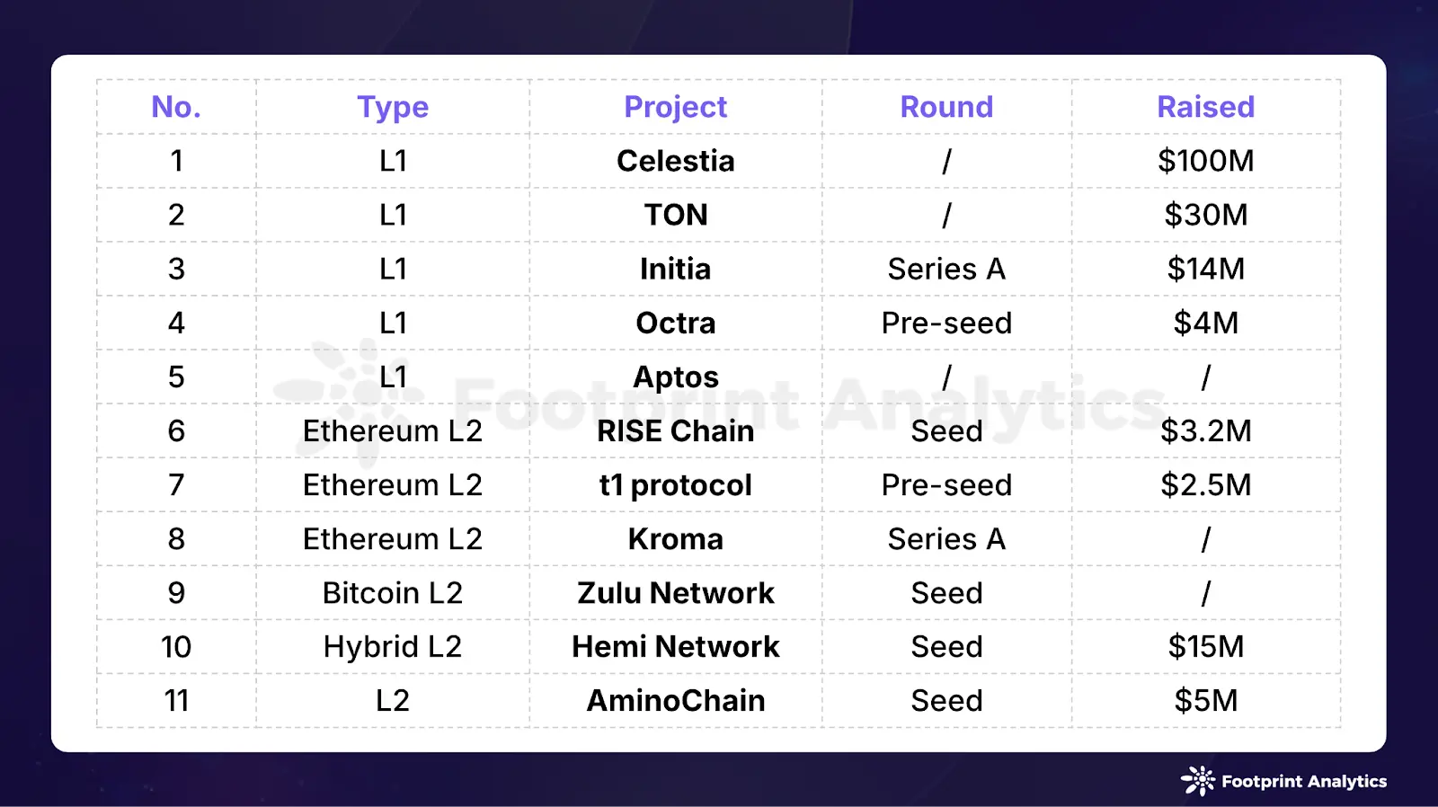 此外,本月还有三条 Layer 1 区块链公布了新的融资轮次:Initia、Octra 和 Aptos。Layer 2 解决方案继续吸引投资者兴趣,比特币 Layer 2 Zulu Network 以及以太坊 Layer 2 RISE Chain、Kroma 和 t1 protocol,此外还有 Hemi Network 和 AminoChain,均获得了资金支持。