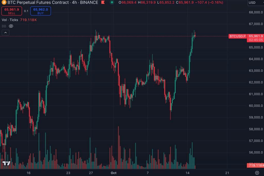比 特币在昨日站上 6.3 万美元之后,又持续高歌猛进。多次快速震盪拉涨突破多个重要窗口,并在今(15)晨接近 7 点时,最高突破 66,500 美元,再次来到九月底的前高测试。