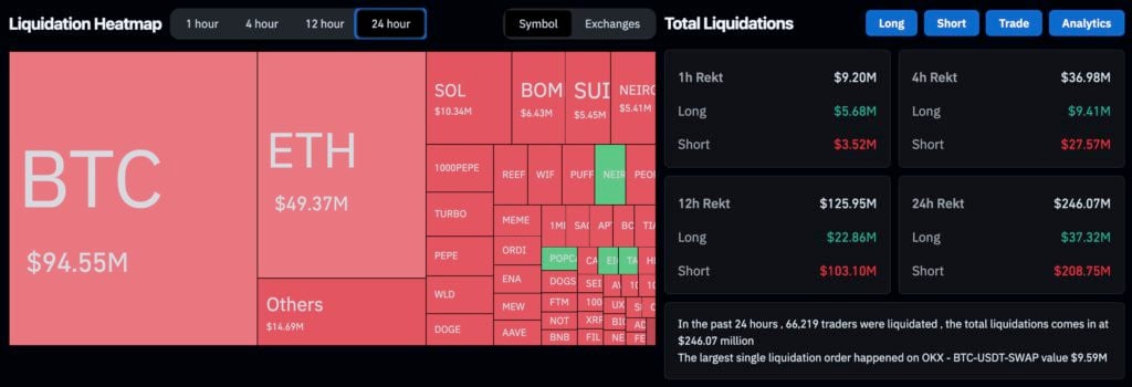 比特币剧烈波动的行情中,据 Coinglass 数据 显示,过去 24 小时,加密货币全网爆仓金额超过 2.4 亿美元(空头占 2.08 亿美元),有近 6.6 万人遭清算。