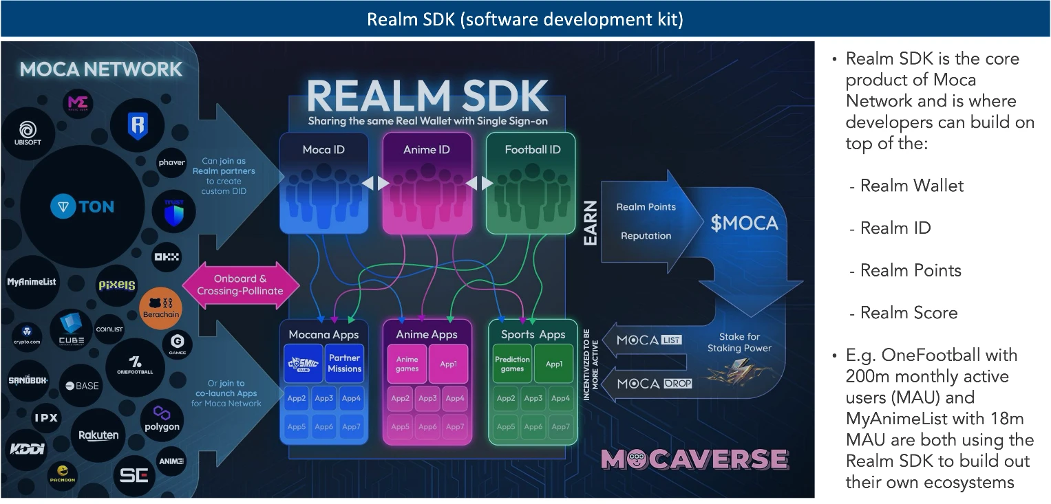 在 Mocaverse 的技术栈方面,团队开发了 Realm SDK,并将其与 Mocaverse 分开进行品牌化,这是经过深思熟虑且高度战略性的选择。通过创建一个中立的技术栈,Realm SDK 成为合作伙伴及潜在合作伙伴更容易采用的工具包,而没有“Realm 代币”或用户锁定。技术栈与 Mocaverse 无缝集成对合作伙伴来说是一项优势,但不带任何强制性。长期来看,这种方式将成为面向消费者应用构建的、强吸引力的技术栈,还能通过 Mocaverse 平台获得更广泛的分发渠道。