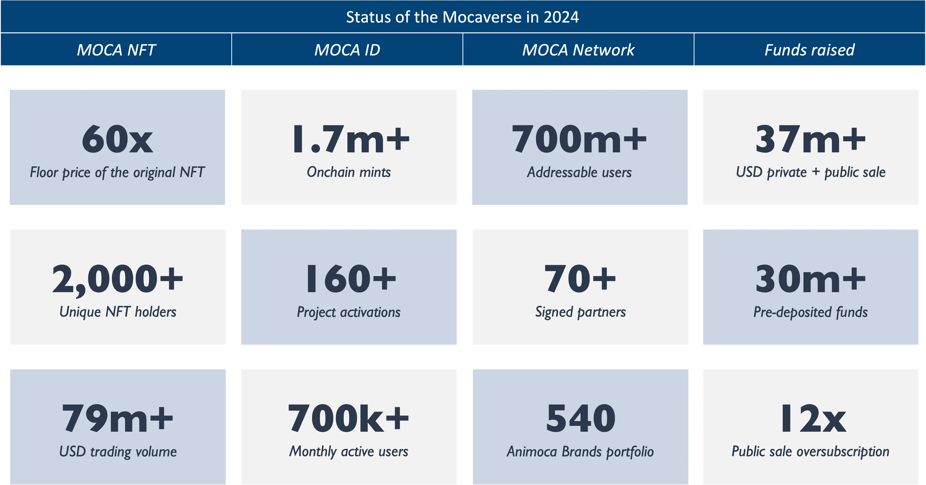 虽然 Mocaverse 项目 2023 年才开始启动,但至今已有近 200 万个 MOCA ID 被铸造,生态系统拥有超过 70 万的月活跃用户。在 Animoca Brand 的项目投资组合中,每周都约有一个新的 TGE,Mocaverse 生态系统内的潜在应用正在不断扩展。