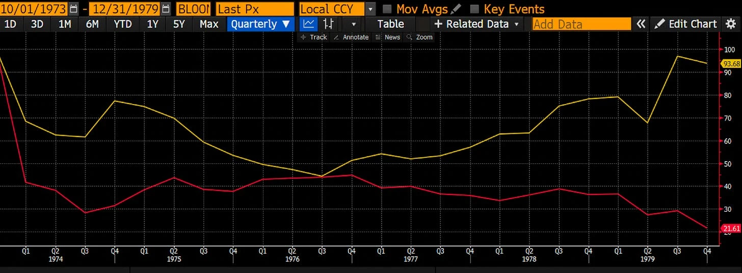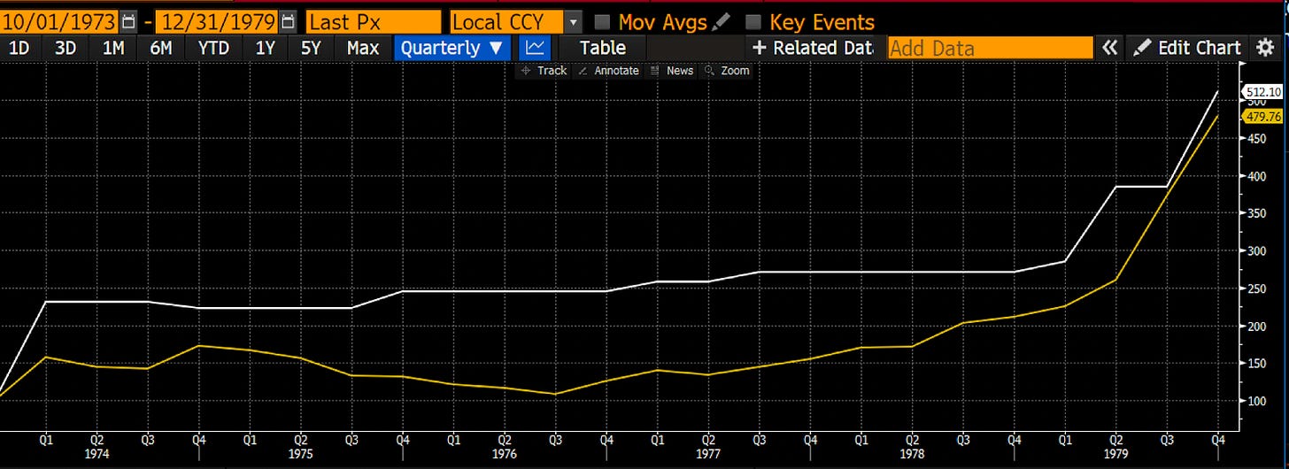 如果你想找一个展示硬通货在能源冲击下韧性的历史例子,可以看看黄金在 1973 年到 1982 年的交易情况。1973 年 10 月,阿拉伯国家对美国实施石油禁运,以报复美国在赎罪日战争中支持以色列。1979 年,由于推翻西方支持的国王并建立现任神权政权的革命,伊朗的石油供应退出了全球市场。