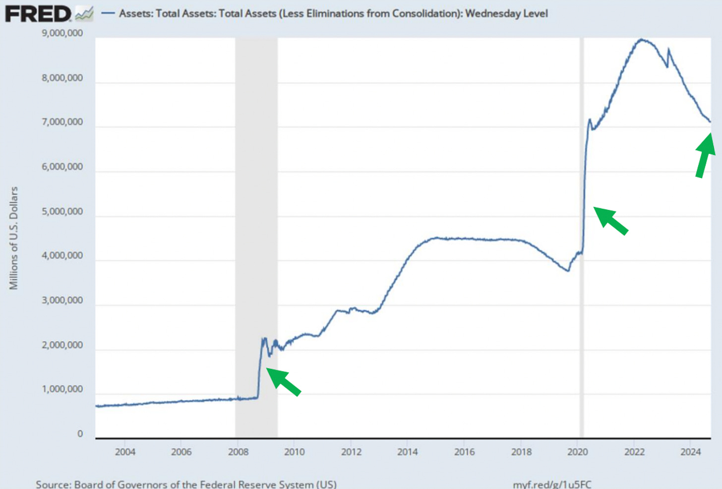 美国政府通过借贷而非储蓄来进行采购。这就是上图所传达的信息。为了向以色列提供免费武器,负债累累的美国政府需要进一步借款。问题在于,当国家储蓄为负时,谁会购买这些债务?图中的绿色箭头标示了美国国家净储蓄为负的时期。 Luke Gromen 指出,这些箭头对应于美联储资产负债表的急剧扩张。