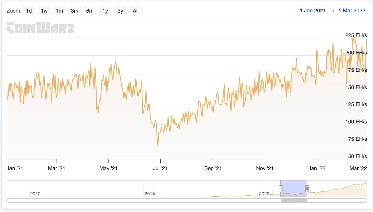 这是从 2021 年 1 月到 2022 年 3 月的比特币网络算力图。
