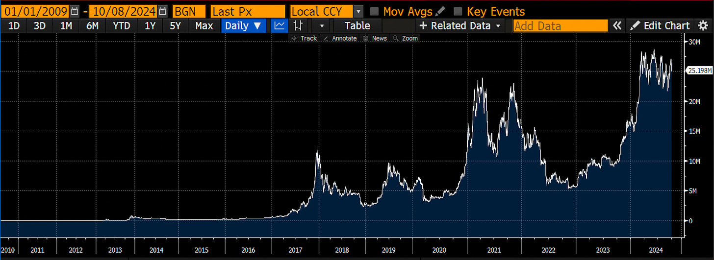 这是比特币价格除以美联储资产负债表的结果,并以 100 为基准。自比特币诞生以来,其表现已经超过了美联储资产负债表增长的 25, 000% 。