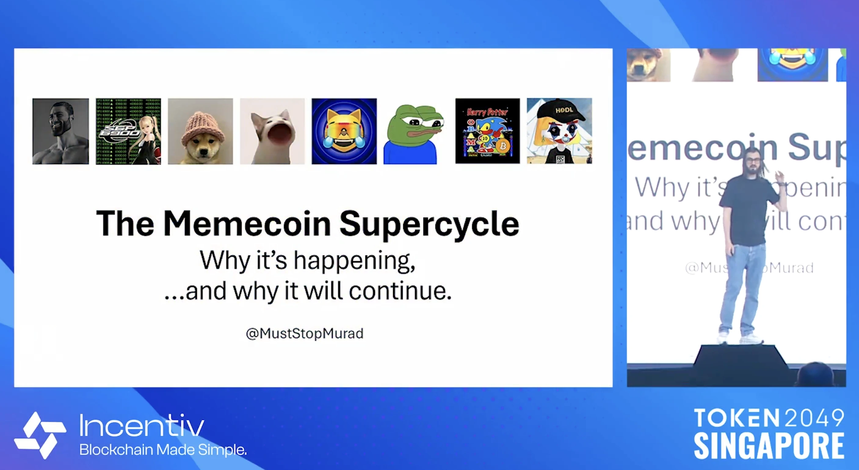 在 9 月份的行业盛会 Token2049 上,Murad 做了一场题为《Meme 币的超级周期》的主题演讲,将 Meme 币在本轮周期已经获得的成绩以及后续还将持续发光发热的现状进行了一番极为生动形象的描摹,基于其呈现的丰富翔实的资料以及其极具感染力和煽动性的语言,该演讲也成为了后续加密市场包括散户及机构投资者热议的话题和内容。(Odaily 星球日报註:笔者把 演讲具体地址 放在这裡,感兴趣的读者朋友可以自行观看。)