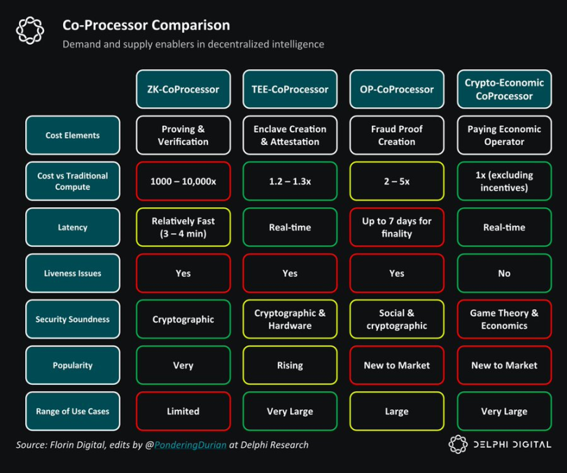 总体而言,协处理器对于将具有高确定性但低性能的区块链与高性能但概率性的智能体融合在一起至关重要。没有协处理器, AI 就不会出现在这一代区块链中。