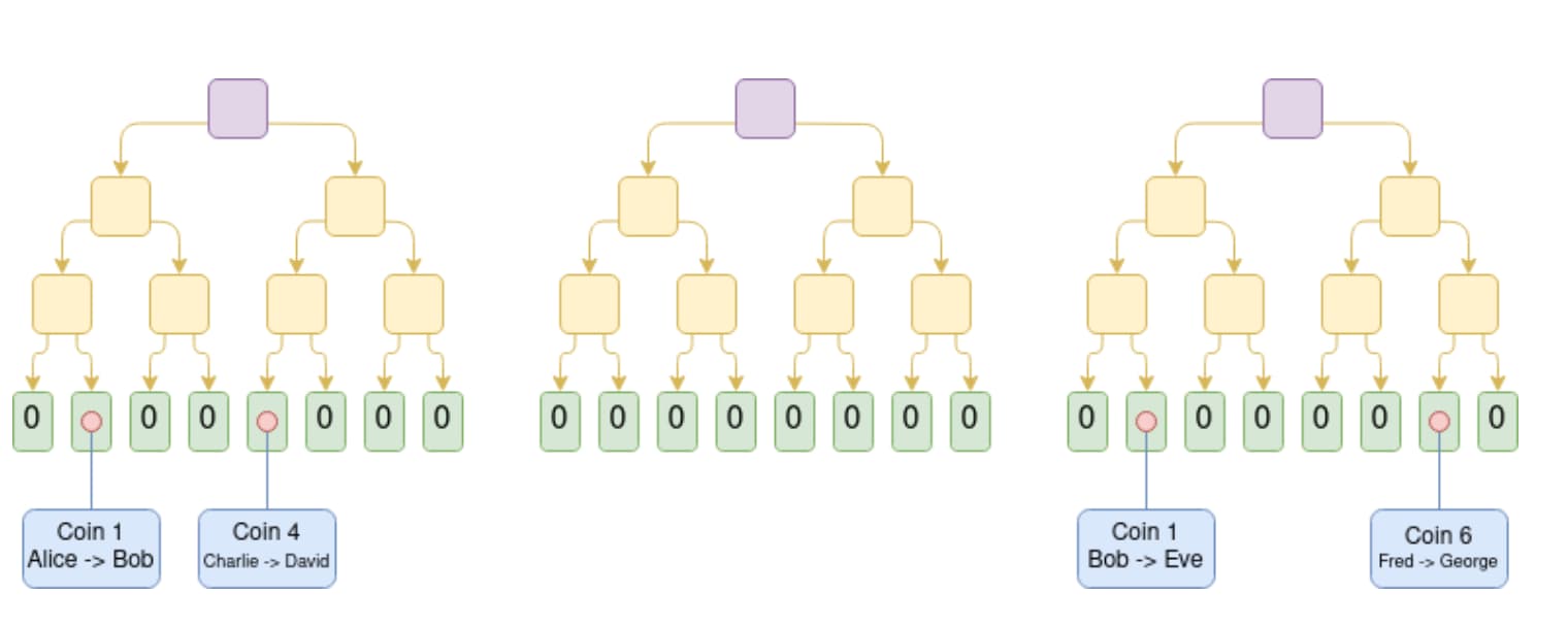 Plasma Cash chain 图。花费硬币 i 的交易被放在 tree 中的第 i 个位置。在此示例中,假设所有先前的 tree 都有效,我们知道 Eve 当前拥有代币 1,David 拥有代币 4,George 拥有代币 6。