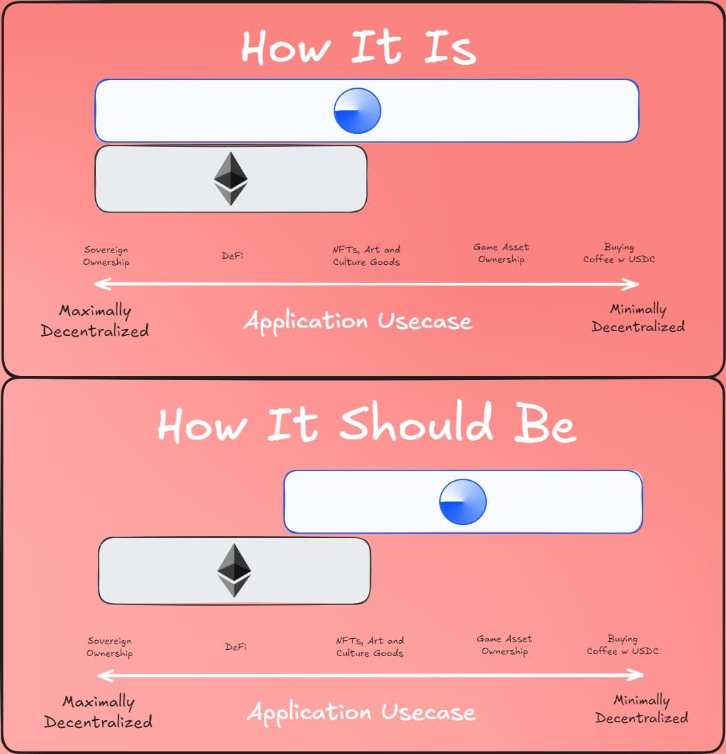 任何 L1 扩容路线图都需要回答的一个重大问题是:L1 和 L2 的最终愿景分别是什么?显然,把所有内容都放在 L1 上是荒谬的:潜在的应用场景可能涉及每秒数十万笔交易,这将使 L1 完全无法进行验证(除非我们采用原生 Rollup 的方式)。但我们确实需要一些指导原则,以确保我们不会陷入这样一种境地:Gas 上限提高 10 倍,严重损害以太坊 L1 的去中心化。