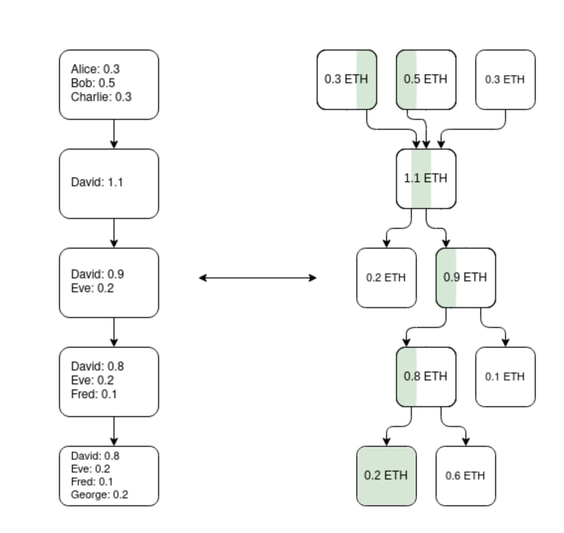 制作 EVM Plasma 链的一种方法(不是唯一的方法):使用 ZK-SNARK 构建一个并行的 UTXO 树,该 tree 反映了 EVM 所做的余额变化,并定义了在历史不同时间点的「同一代币」的唯一映射。然后可以在其上构建 Plasma 结构。