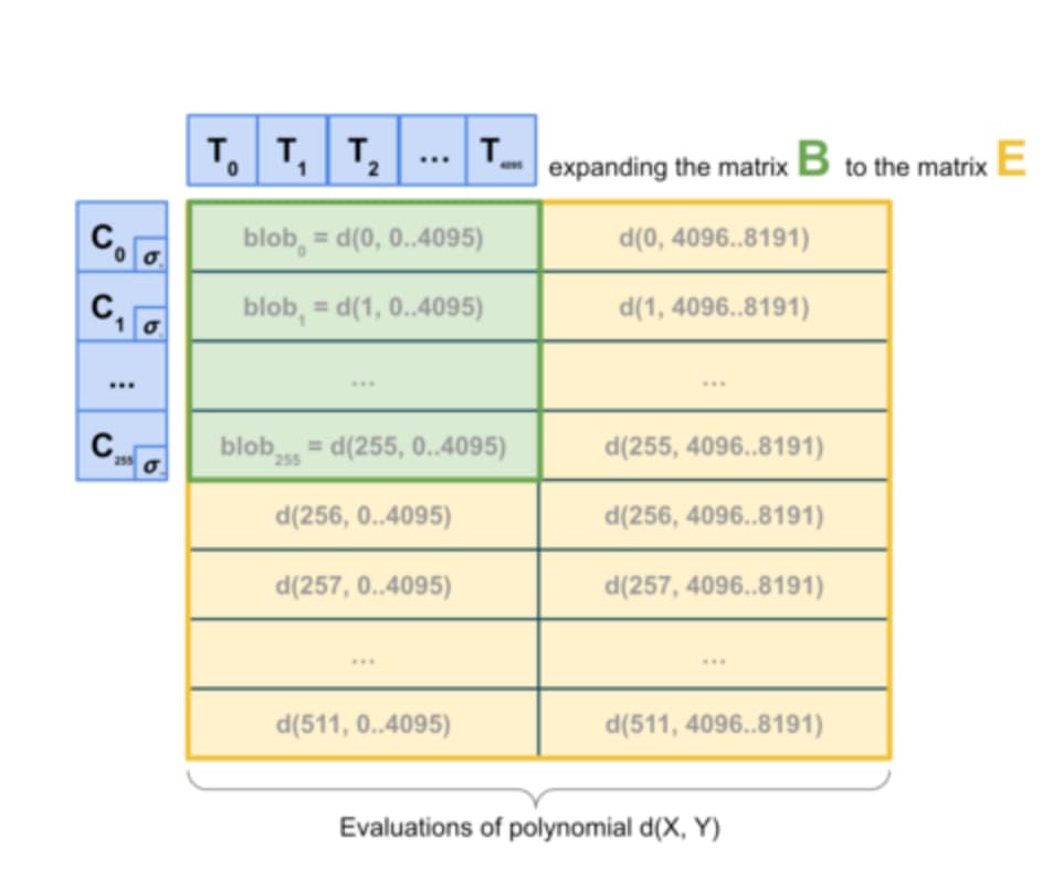 因此,最终我们想更进一步,进行 2D 采样,它不仅在 blob 内,而且在 blob 之间进行随机采样。KZG 承诺的线性属性用于扩展一个区块中的 blob 集,其中包含对相同信息进行冗余编码的新虚拟 blob 列表。
