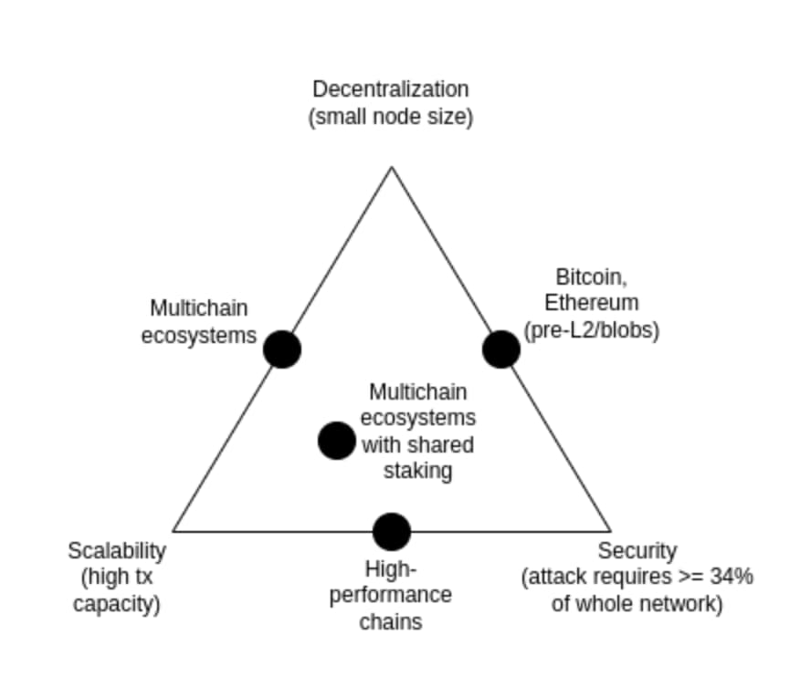 可扩展性三角悖论是 2017 年提出的一个想法,它认为区块链的三个特性之间存在矛盾:去中心化(更具体地说:运行节点的成本低)、可扩展性(处理的交易数量多)和安全性(攻击者需要破坏网络中很大一部分节点才能使单笔交易失败)。
