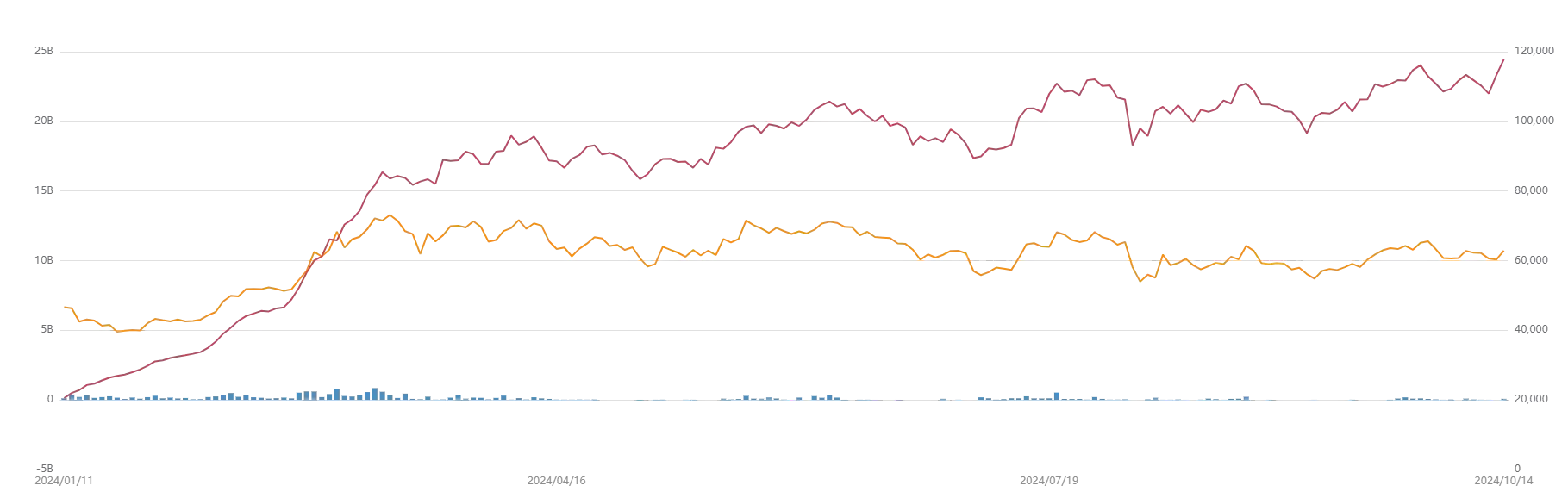 IBIT 净资产(左轴)、比特币价格(右轴)