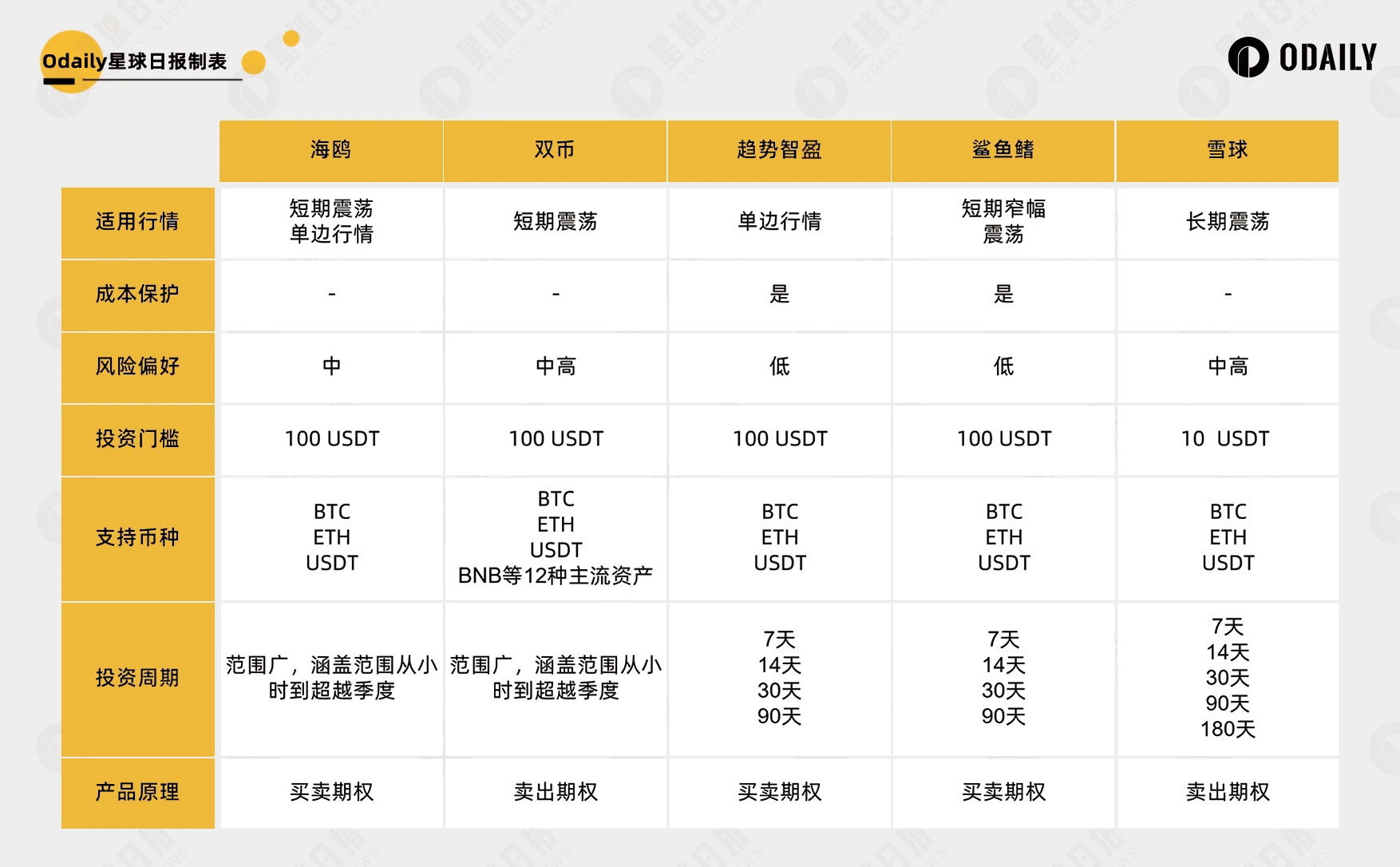 下图为 Matrixport 部分产品示例,涵盖了不同风险偏好用户所需的多层级结构化产品。低风险偏好的用户能够选择活期存、鲨鱼鳍、趋势智赢等基础产品,而进阶用户同样能在 Matrixport 参与雪球、海鸥等基于期权的进阶结构化产品。