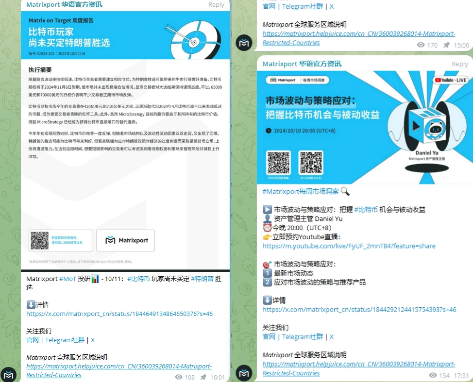 除投资产品外,Matrixport 针对投资见解提供了多种分享渠道,旨在为用户提供前沿、专业的投资参考。同时,Matrixport 还将通过 官方 Telegram 频道 和 官方 X 账户 定期输出重要事件、市场见解和结构化投资策略等多方面专业内容。