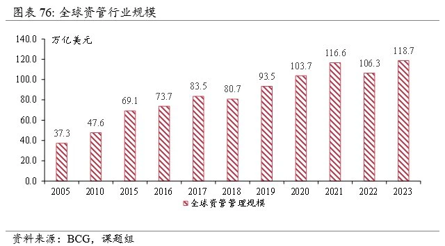 BCG 数据显示,截至 2023 年年末,全球资产管理行业的管理资产规模(AuM)达到约 118.7 万亿美元,而全球股市市值同期为 115.0 万亿美元,可见在传统金融中资管需求量之高,发展之稳健。