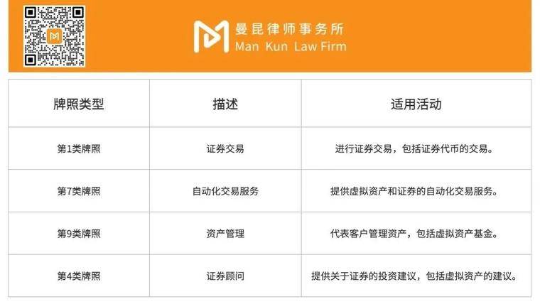 当然,从事虚拟资产相关业务,也不一定非得是为投资人提供交易服务,也可以涉足比如提供投资咨询与建议,那么就要考虑到 4 号牌照 。不管是公司,还是个人,诸如加密投资分享类电报群主、虚拟货币投资顾问,都需要持 4 号牌「上岗」,否则会面临监管问题。