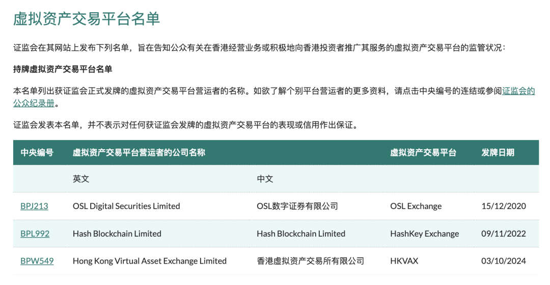 2024 年 10 月 3 日,香港证监会 SFC 官网更新持牌虚拟资产交易平台名单,公布最新持牌交易所 HKVAX,这是继 OSL Exchange 和 HashKey Exchange 后的第三家被香港监管机构认可的虚拟货币交易所。根据香港知名新闻媒体明报的报道,HKVAX 已经持有 SFC 颁发的 1 号(证券交易)和 7 号(提供自动化交易服务)牌照,为香港虚拟货币投资者提供 OTC 经纪服务、虚拟货币交易以及全方位虚拟资产托管服务。