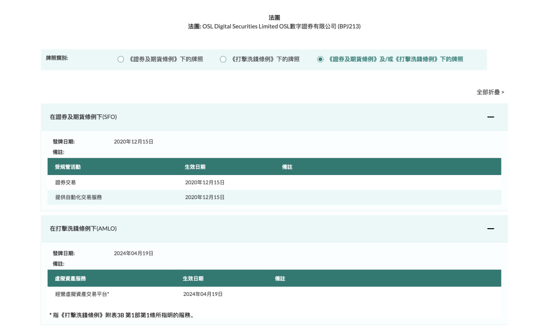 - OSL Exchange ,已获得 1 号和 7 号牌照,及经营虚拟资产交易平台许可