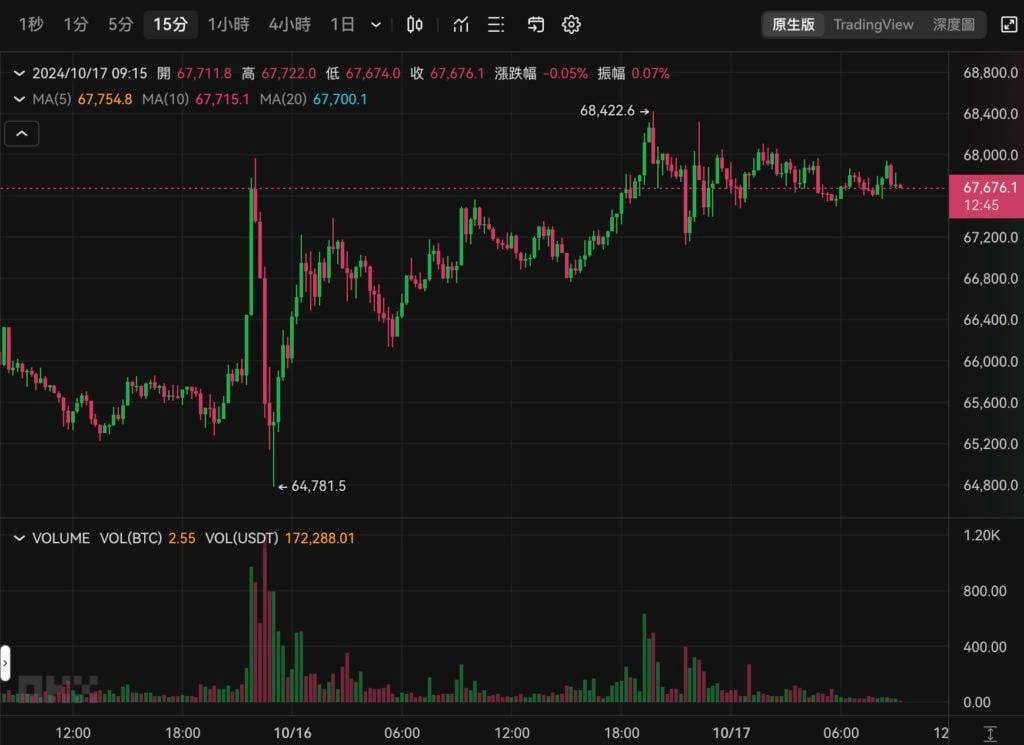 比 特币在经历前天(15)上沖下洗的大波动之后,昨晚在震盪上涨中于 20:00 前正式突破 6.8 万美元,最高触及 68,422 美元。不过随后卖压涌,撰稿当下暂报 67,676 美元,近 24 小时上涨 0.61%。