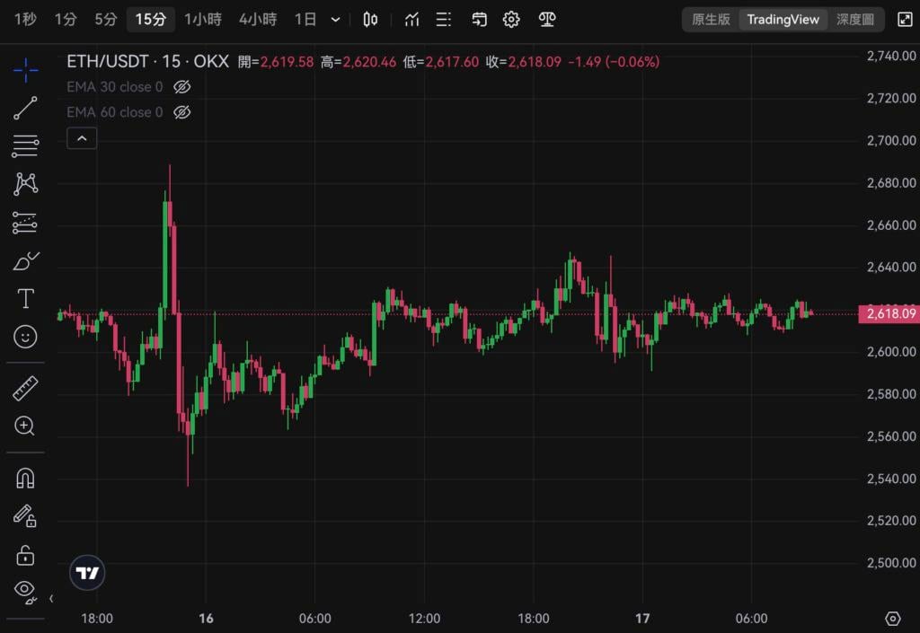 以太坊部分则更为弱势一些,昨晚虽然也有随比特币拉涨,但是很快又回到 2600 美元水平之间持续震盪,撰稿当下暂报 2,618 美元,近 24 小时微幅下跌 0.07%。