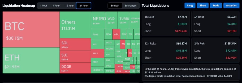 比特币波动的行情中,据 Coinglass 数据 显示,过去 24 小时,加密货币全网爆仓金额超过 1.25 亿美元,有近 4.7 万人遭清算。