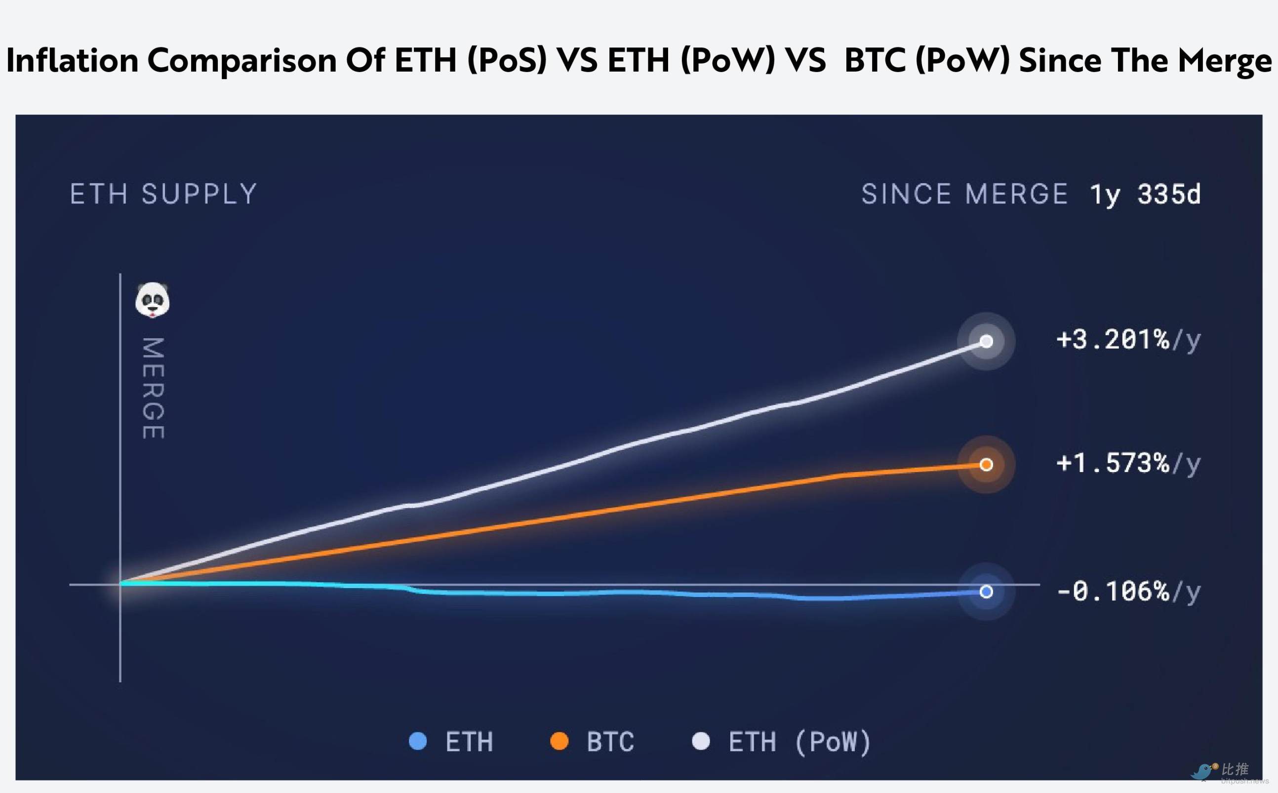 来源:Ultra Sound Money。数据获取时间为 2024 年 8 月 15 日。自合并以来 ETH (PoS) 与 ETH (PoW) 与 BTC (PoW) 的通货膨胀率比较。