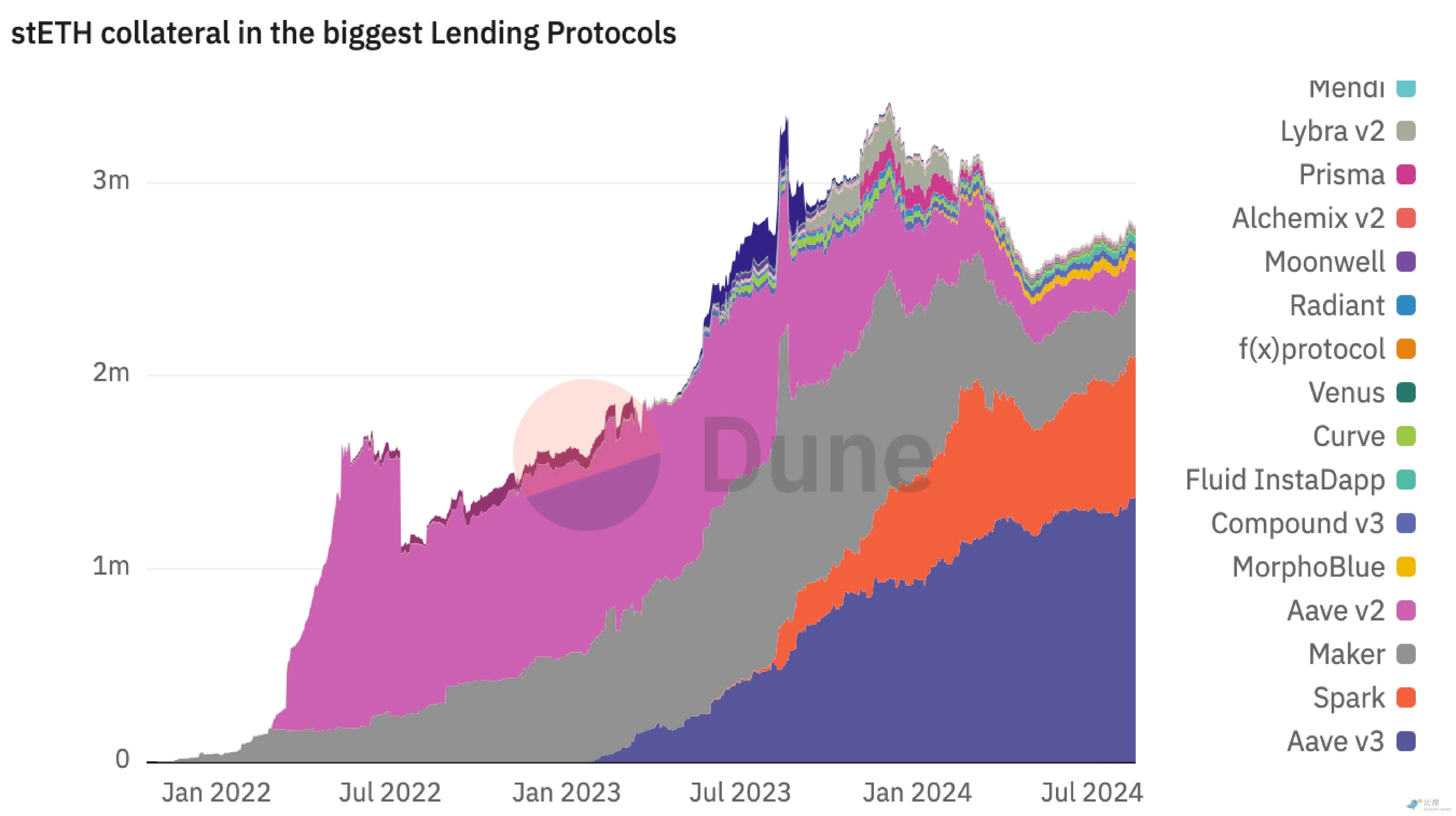 注意:此第三方图表左侧 Y 轴以 stETH 数量衡量,而不是 stETH 的美元金额。来源:截至 2024 年 8 月 15 日的 Dune(@lido/stETH 抵押品与其他抵押品的比较)。