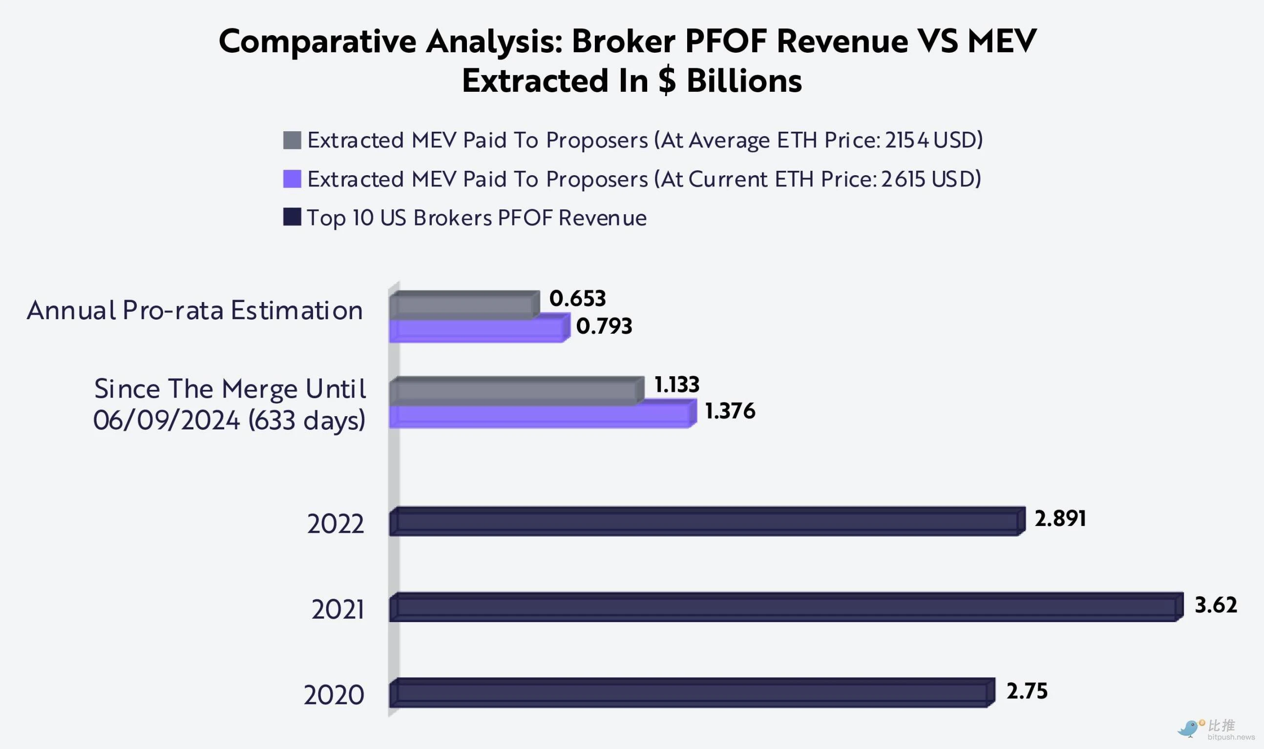 虽然以太坊上的 MEV 与股票市场上的 PFOF 产生的收入相当,但 MEV 占 ETH 和 ERC-20 代币总市值的百分比远高于美国股票市场的百分比。自合并以来,每年按比例提取的 7.9 亿美元收入占 ETH 3150 亿美元市值的 0.20% 。ETH 和 ERC-20 代币的总市值约为 5000 亿美元,提取的收入百分比降至 0.15% ,仍然比 PFOF 收入 28.91 亿美元占美国股市 50 万亿美元市值的 0.0056% 高 27 倍。在早期开发阶段,以太坊的订单路由机制比传统金融中的订单路由机制更昂贵,但值得注意的是,以太坊通过智能合约支持更广泛的订单类型——例如闪电贷、质押、掉期——以及与去中心化应用程序的其他交互。