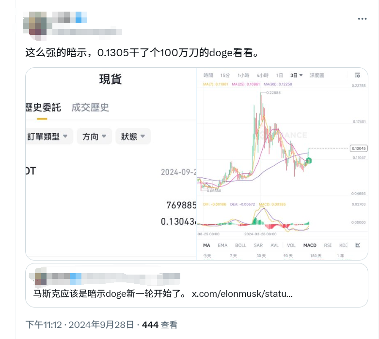 通过梳理,显而易见的事实是 D.O.G.E 完完全全属于「大选」概念,而不是「猫猫狗狗」概念。每次马斯克在推特提及 D.O.G.E,市场上也会因为此等信息差闹出一些类似的误会:在 9 月 28 号 马斯克再次发布 D.O.G.E 相关推文后,有许多不太了解链上“角度”魅力的二级玩家觉得此举是在暗示狗狗币,遂直接买入 $DOGE,最后的结果就是默默流泪,割肉离场。