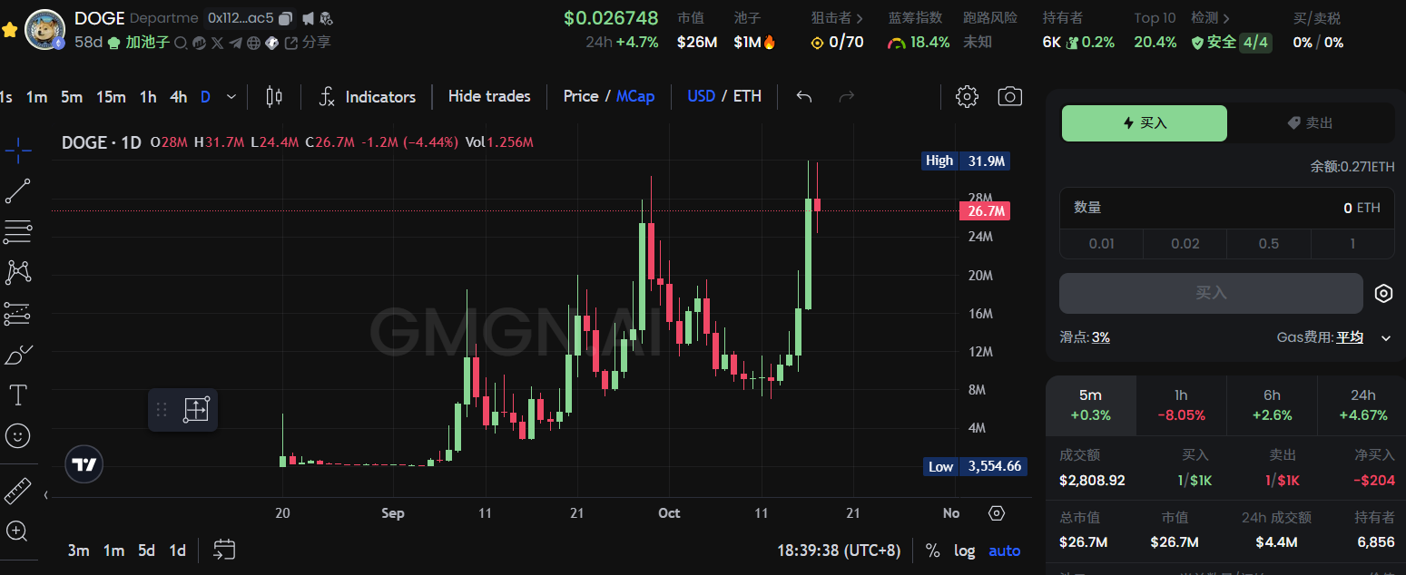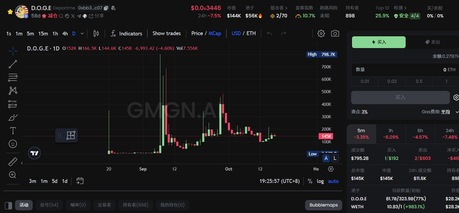 与其他代币不同的是这个 $D.O.G.E. 有四个点,同时无重名代币,最近走势向上趋势明显。不足之处同样是交易量过小,社区不太活跃。