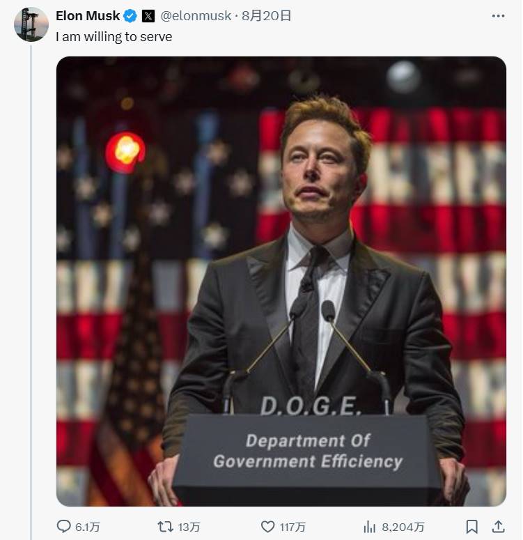 在首次提到这个概念几天后, 8 月 20 日马斯克在推特账号上发布了一张 AI 生成的图片,图片上标有“ Department Of Government Efficiency”,并配文“我愿意服务”。