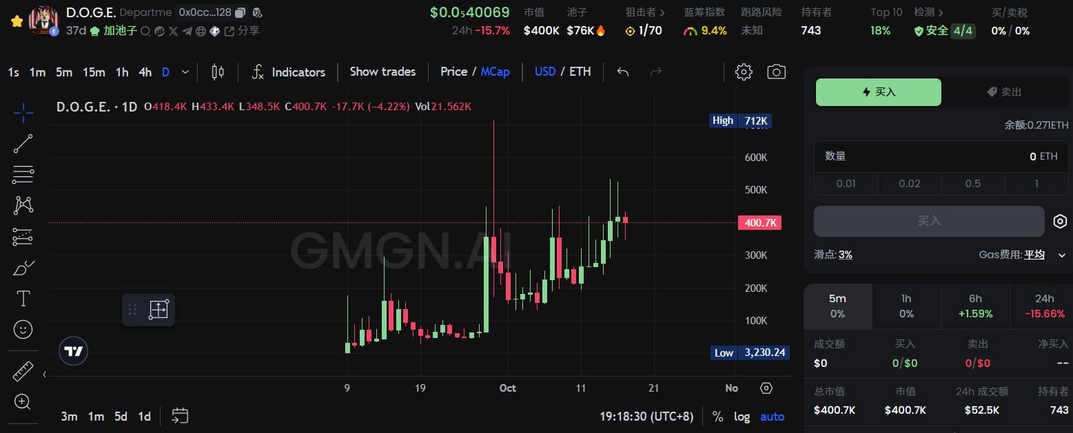 这个 $D.O.G.E 在 9 月即马斯克将 D.O.G.E 概念推文置顶之后才发射,印象中走势略有“阴谋集团”的感觉。作为后来者,上线三天内就经历「 爆拉——暴跌十倍——再拉——再跌」的极度折磨,直到狙击的钱包地址将筹码全部抛售,币价才逐渐稳定。当前在 D.O.G.E 概念中热度第二,市值维持在 400 k 至 900 k 之间上下浮动。不足之处是筹码较为分散且交易量较小,共识尚未凝聚 PvP 现象略严重,价格波动大。