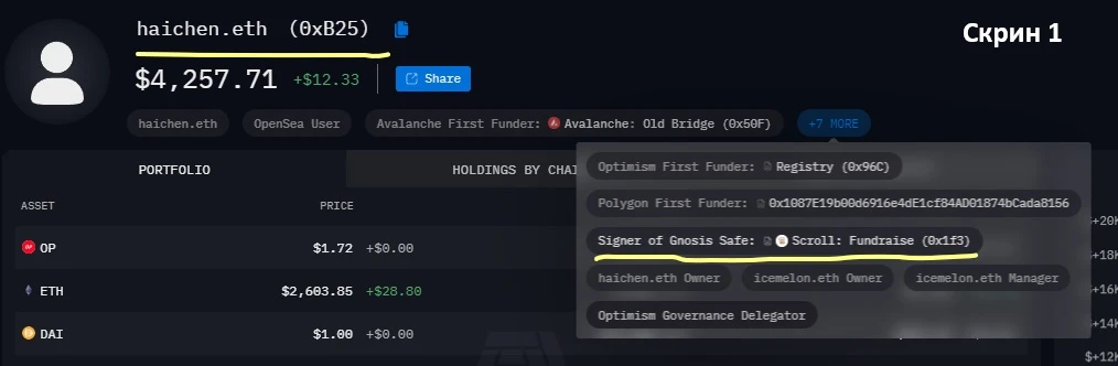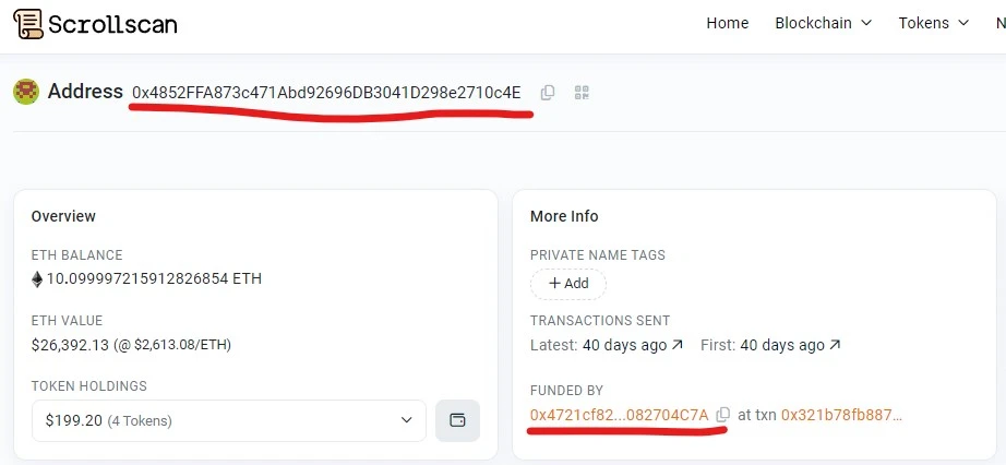 该地址在以太坊主网的资金最初来源于 haichen.eth,在 Scroll 上的资金最初则来源于「团队地址#1 」。