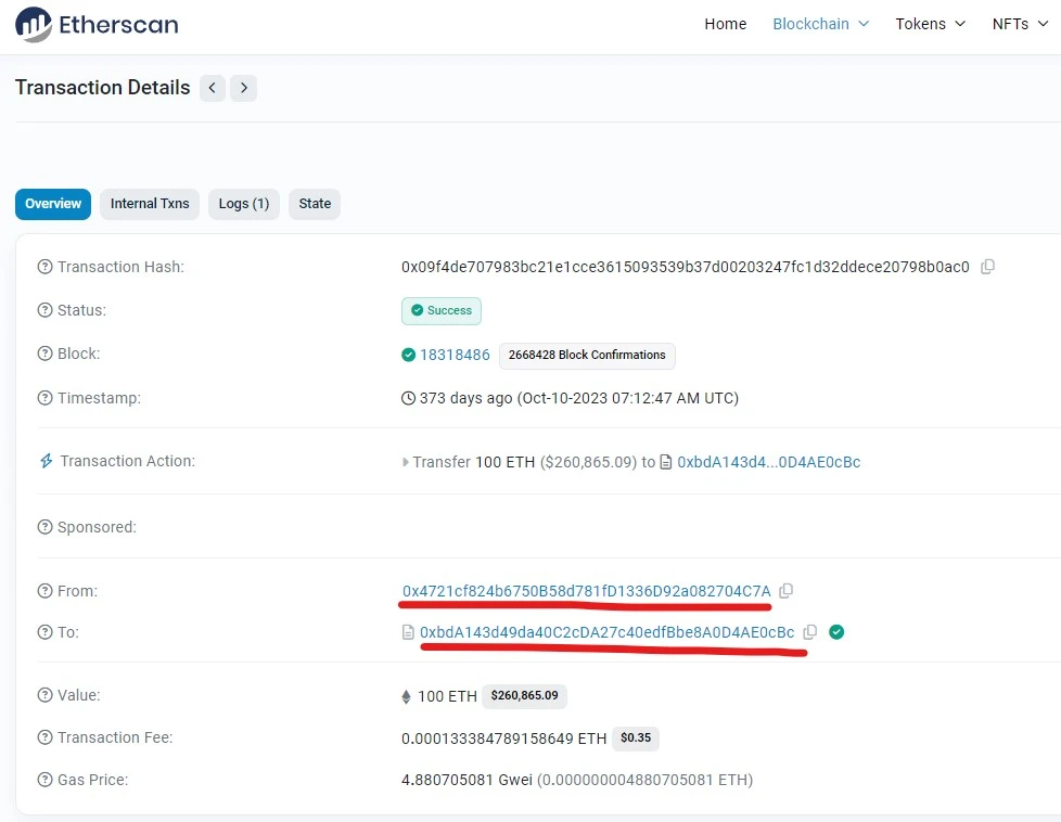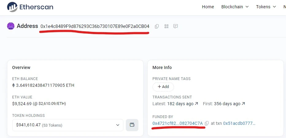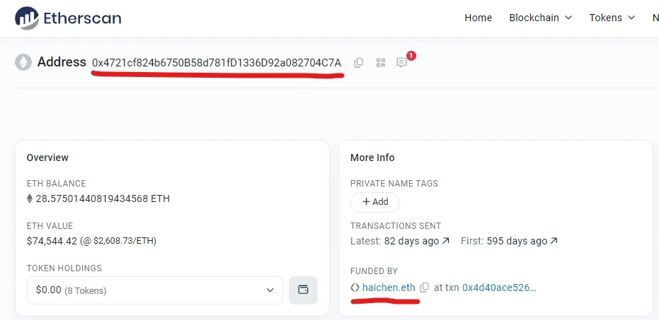 第一个需要关注的地址是 0x4721cf824b6750B58d781fD1336D92a082704C7A。